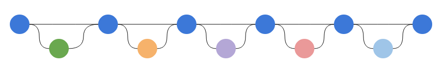 5번 작업도 예를 들어보면, 동료와 같이 같은 기능을 개발하면 하나의 feature 브랜치에 커밋을 하게 됩니다. 서로 같은 커밋에서 시작했다가 feature 브랜치에 하나씩 merge 되기도 하고 얽히고설켜서 merge 되기도 합니다. 그러면 커밋 그래프가 복잡해지고 이력 확인을 할 때도 어렵게 됩니다. 그래서 커밋을 순차적으로 만들기 위해서 작업한 커밋이 feature의 최신 상태에서 시작하도록 rebase를 수행합니다.